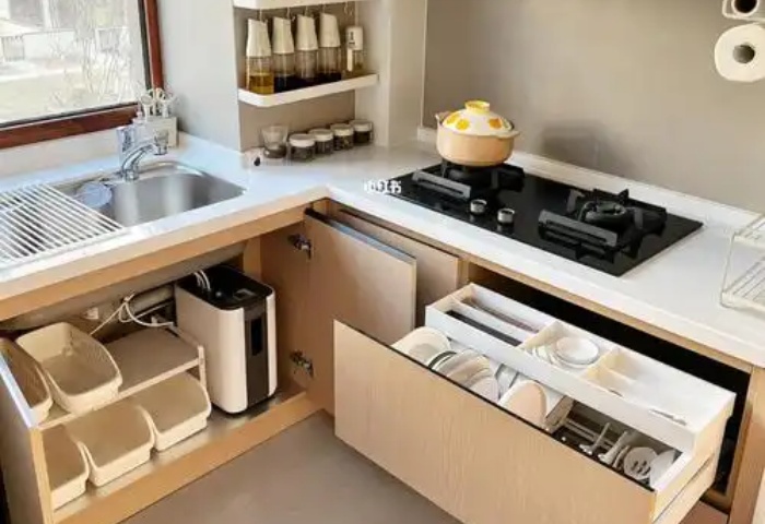 櫥柜是廚房收納的主要場所。可以使用分層置物架,將櫥柜的空間分層利用,放置不同高度的物品。例如,將盤子、碗等疊放在一起,放在下層,而上層可以放置一些不常用的餐具或小型電器。