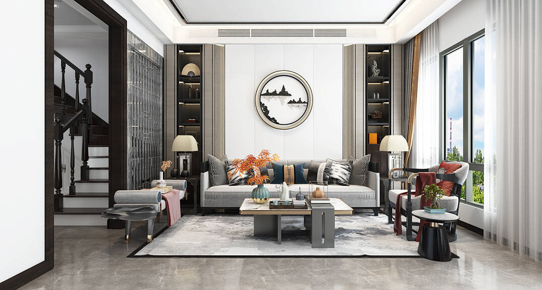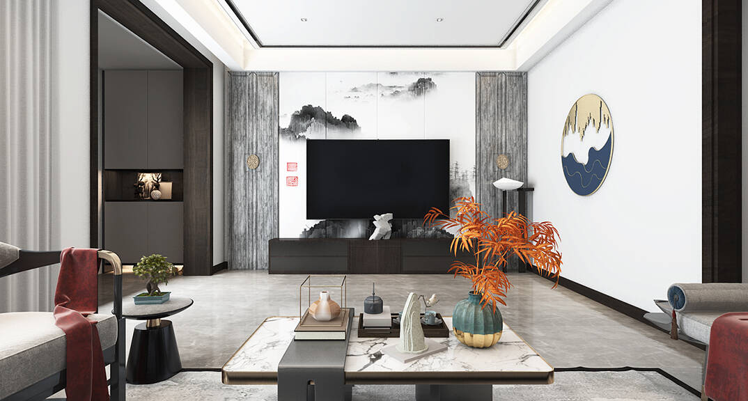背景飾畫浪漫的格調與東方中式家居的沉穩相結合是本案例特點之一。從現代的角度考慮生活的舒適性,以新中式風格家具置入客廳,質感的材質,照顧到人的舒適感,讓設計賦予美的同時,又能夠實現外在形式中,回歸到實用的一面。