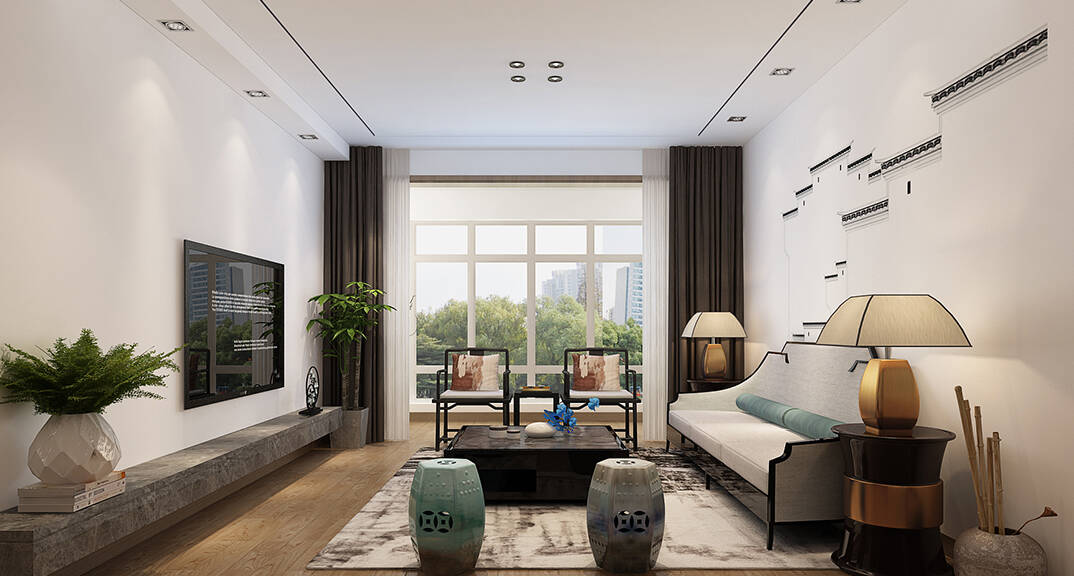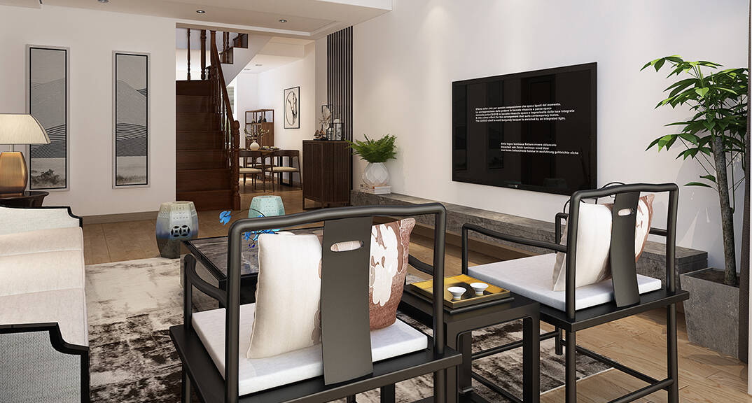 麗都國際310㎡別墅客廳現代中式風格裝修案例效果圖
