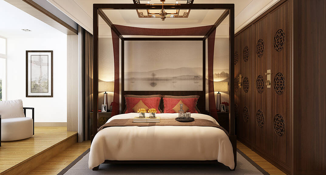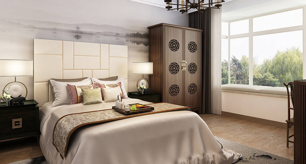 麗都國際310㎡別墅主臥現代中式風格裝修案例效果圖