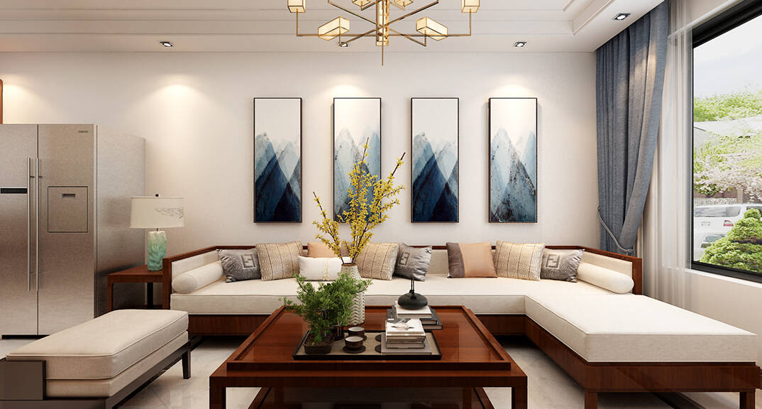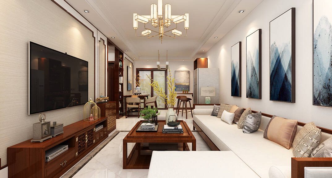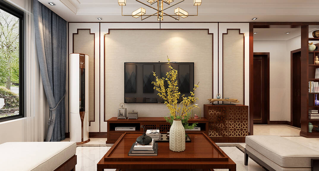 色彩搭配上主要運用實木線條體現中式風格的質感,搭配石膏板線條吊頂,更增加了空間的靈活性。