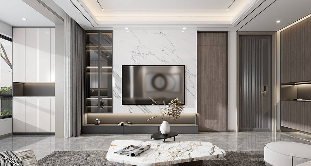 溫莎郡135㎡三室一廳客廳電視墻現(xiàn)代簡約風(fēng)格裝修案例效果圖