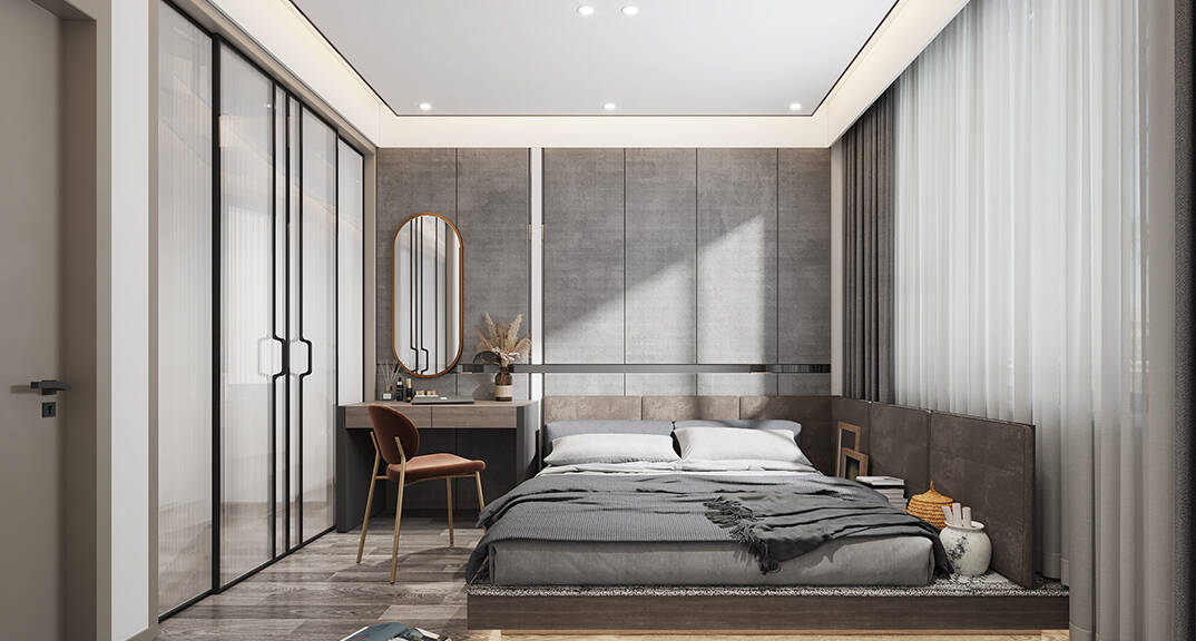 溫莎郡135㎡三室一廳臥室電視墻現(xiàn)代簡約風(fēng)格裝修案例效果圖
