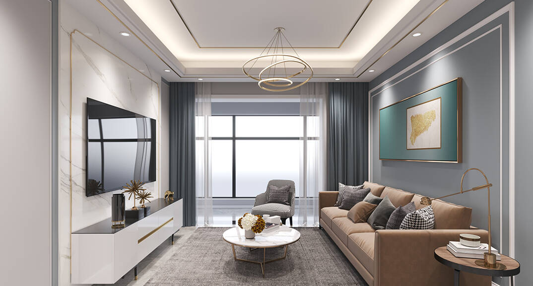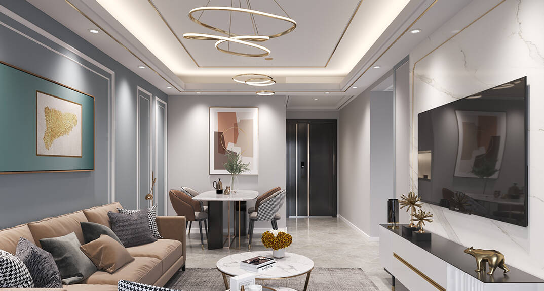 膠州機(jī)場(chǎng)公寓93㎡二室一廳客廳輕奢風(fēng)格裝修案例效果圖