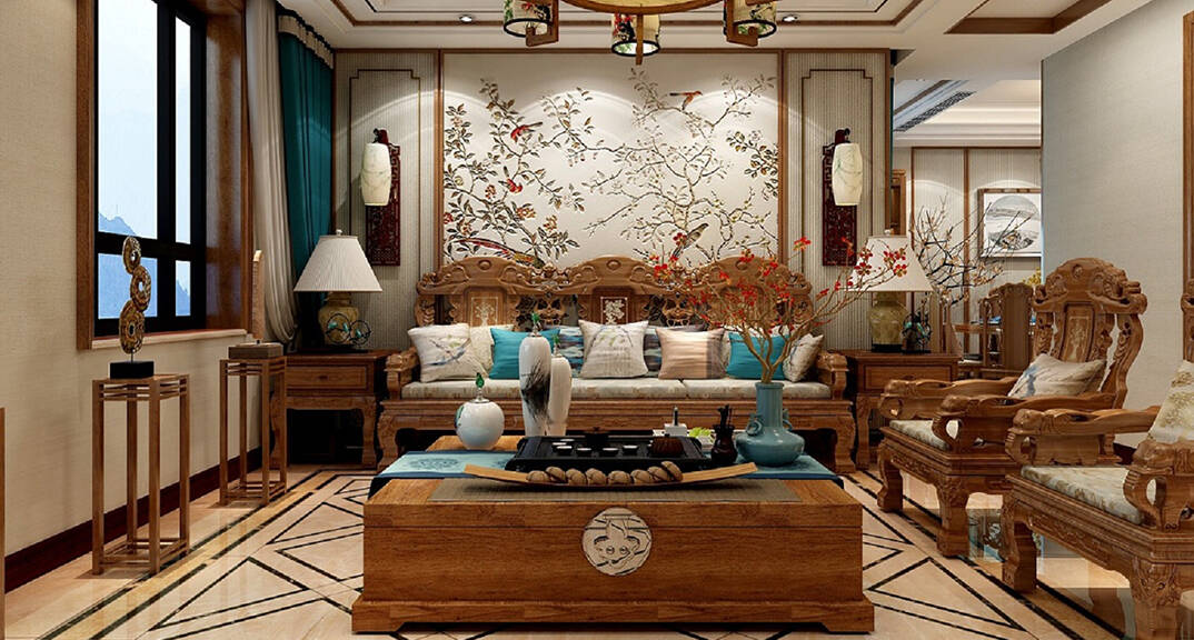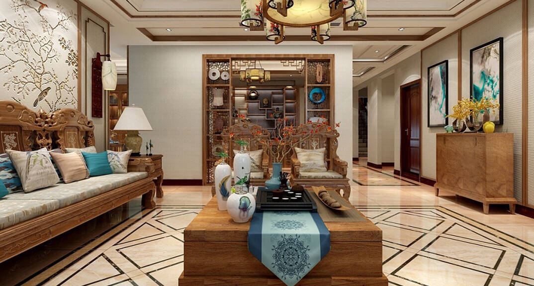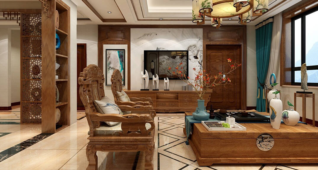 海川泓久山墅635㎡別墅客廳新中式風格裝修案例效果圖