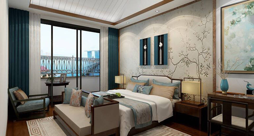 海川泓久山墅635㎡別墅臥室新中式風格裝修案例效果圖