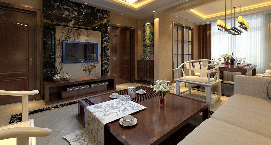 百通尚風尚水160㎡二室二廳客廳電視新中式風格裝修案例效果圖