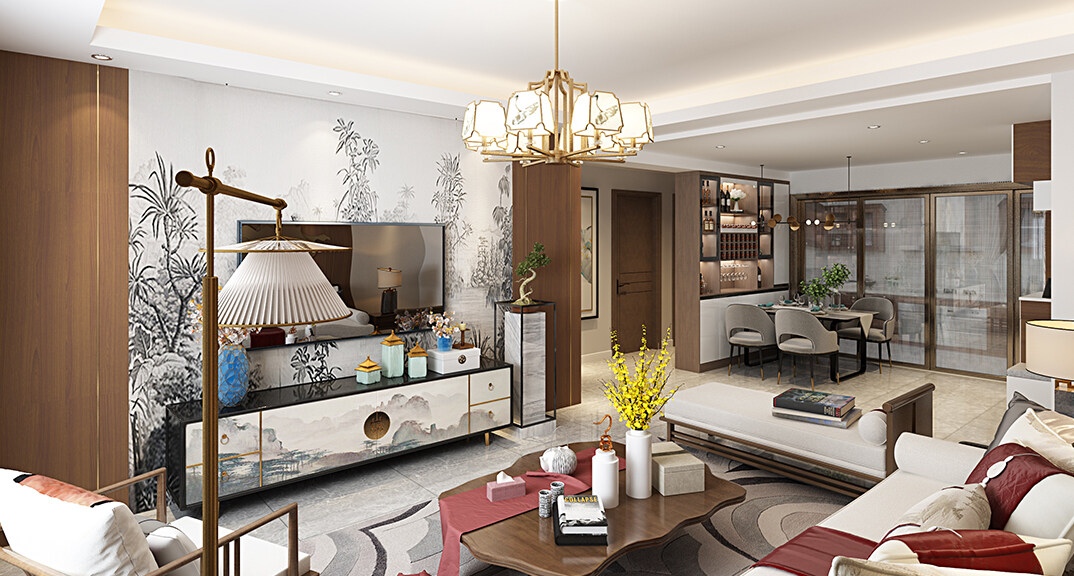 天寧首府128㎡三室兩廳客餐廳新中式風格裝修案例效果圖