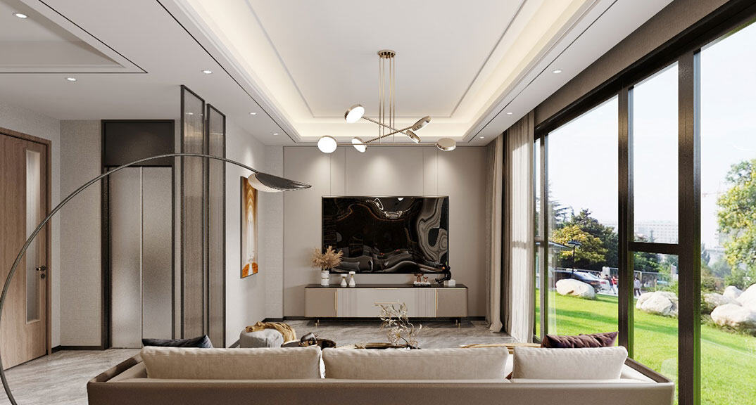 青島小鎮175㎡別墅下疊客廳電視輕奢極簡風格裝修案例效果圖