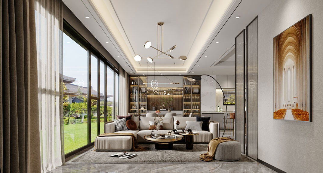 青島小鎮175㎡別墅下疊客廳沙發輕奢極簡風格裝修案例效果圖