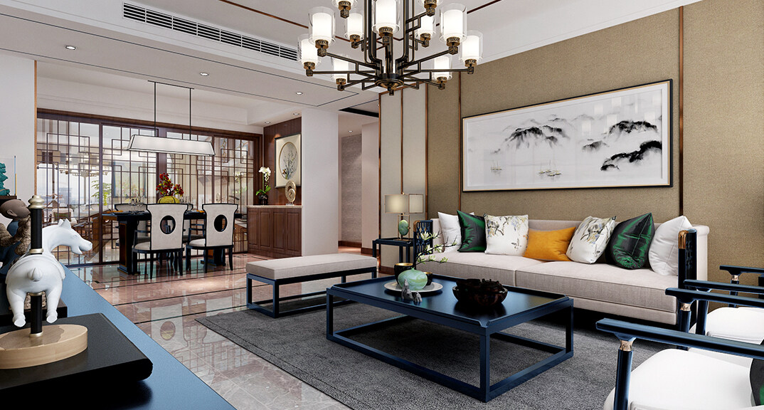 安泰悅湖灣138㎡三室兩廳客廳沙發新中式風格裝修案例效果圖