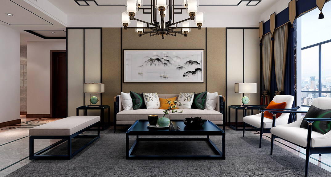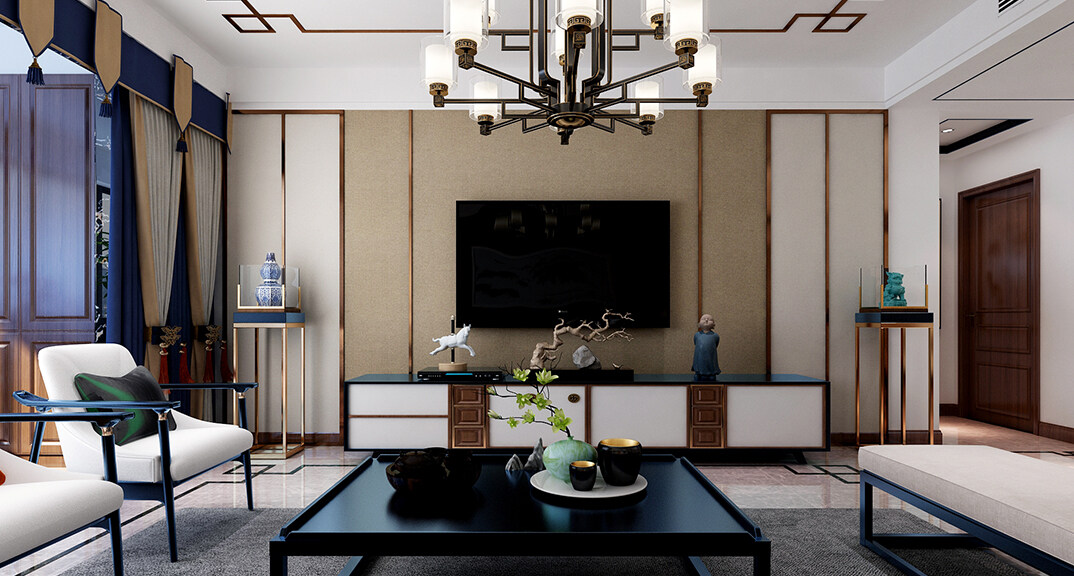 安泰悅湖灣138㎡三室兩廳客廳新中式風格裝修案例效果圖