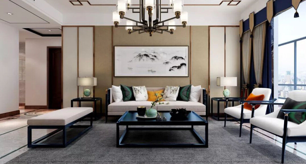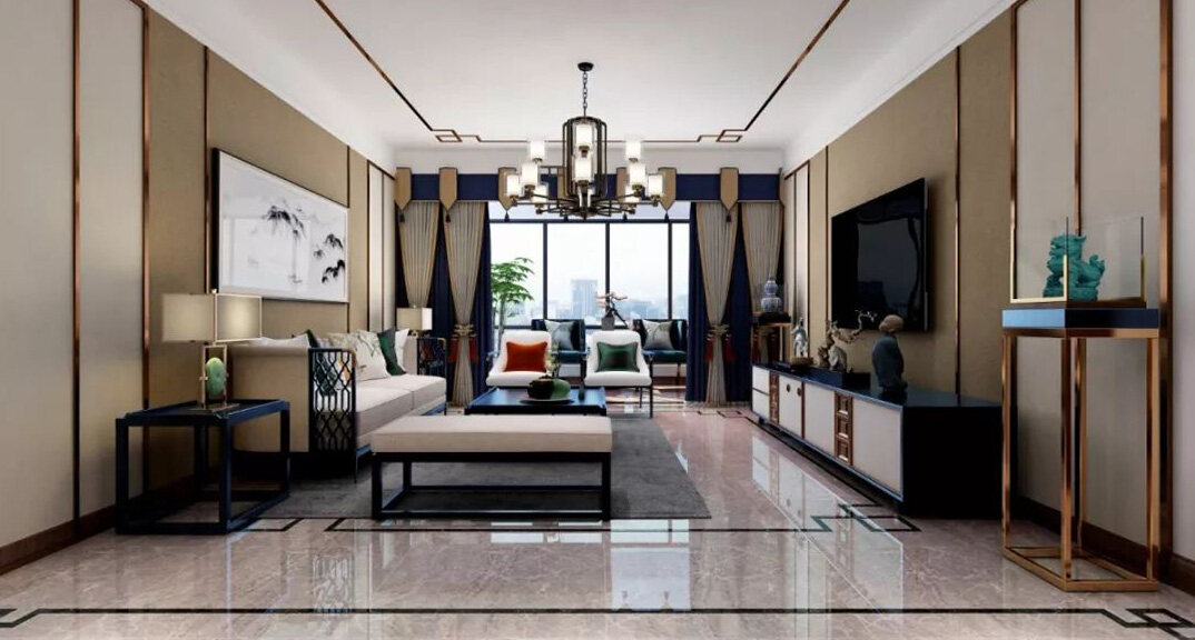 悅湖灣135㎡三室兩廳客廳新中式風格裝修案例效果圖
