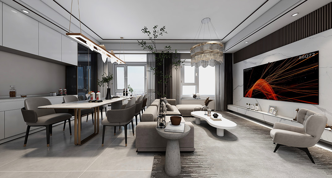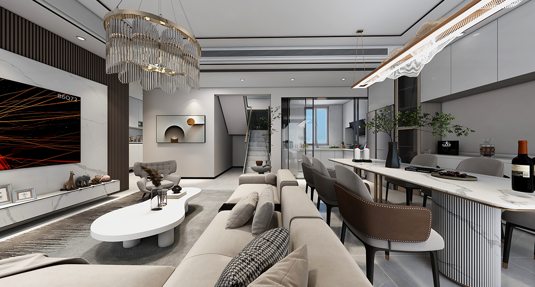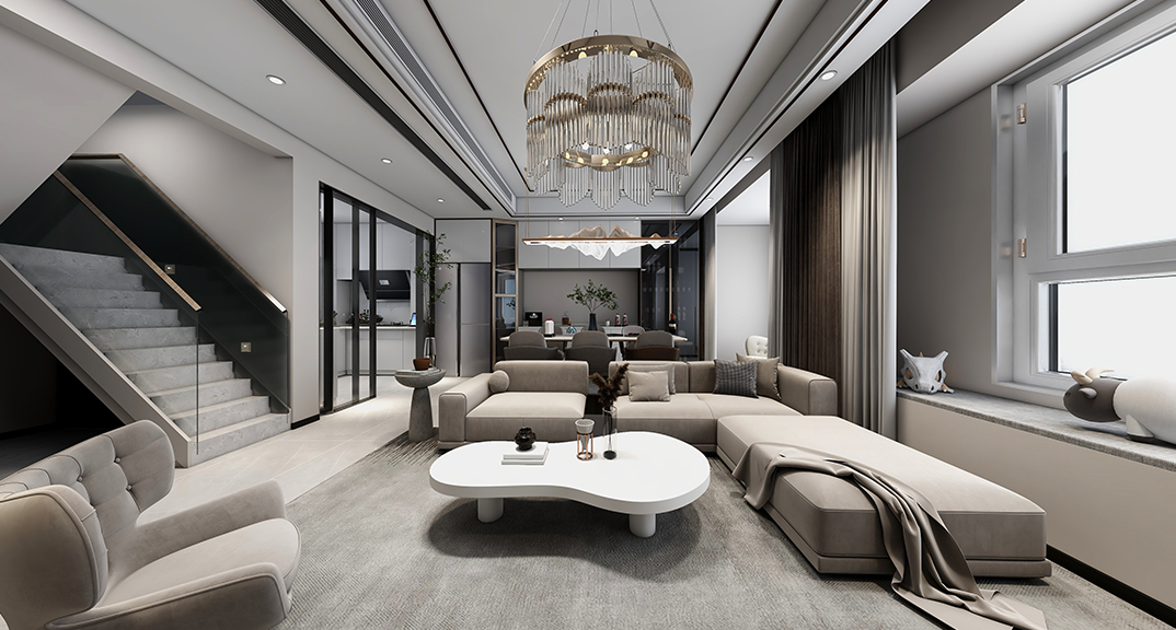 昆侖府150㎡疊拼上疊客廳現代輕奢風格裝修案例效果圖
